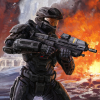 The image depicts a science fiction scene with a soldier in a space marine suit, holding a futuristic weapon. The soldier appears to be facing an explosion or a battlefield scenario. This artwork likely represents elements of the Halo franchise, which is known for its blend of science fiction and action genres.
