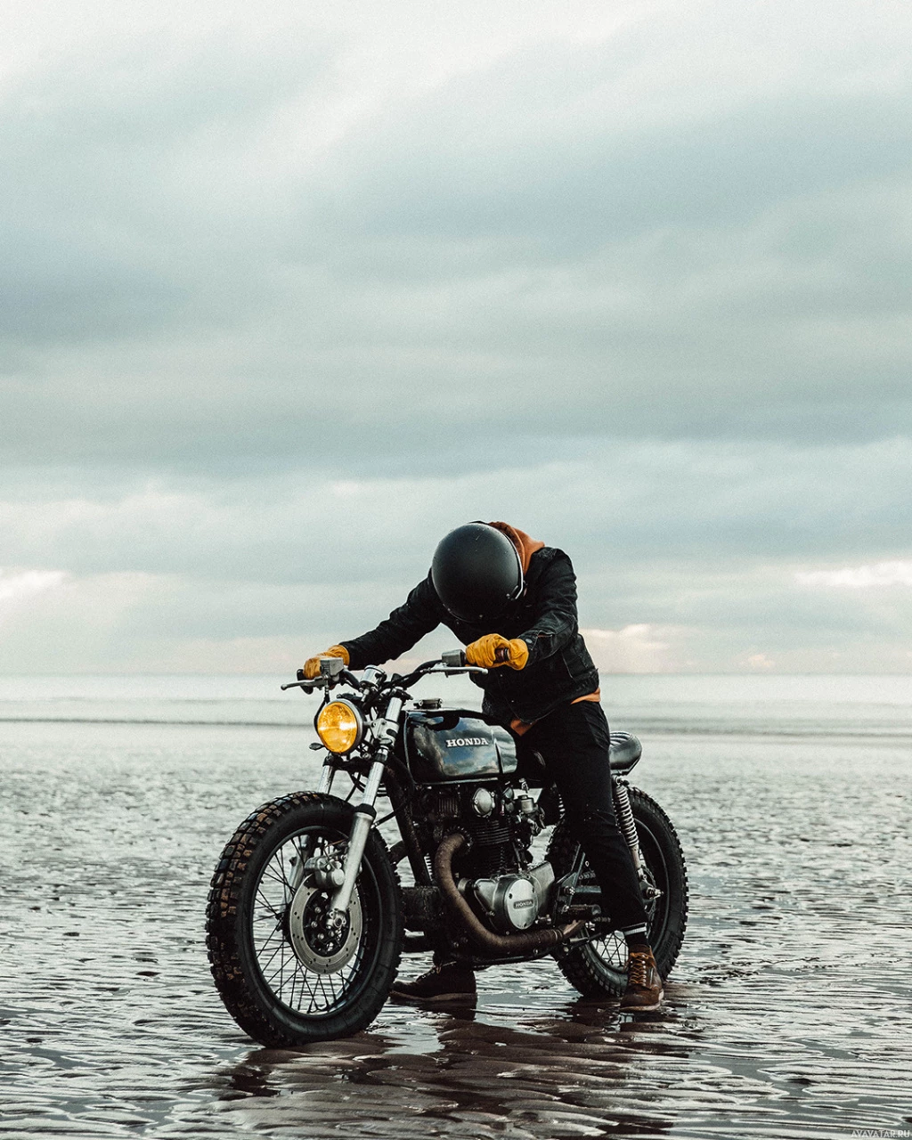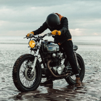 The picture shows a person riding a motorcycle on the beach, with