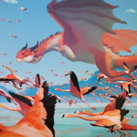 large wings spread out and its body partially submerged in water. The dragon appears to be interacting with several flamingos, which are gathered around it. The birds are of