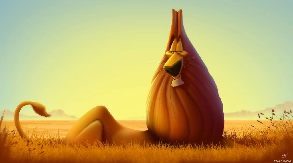На картинке изображен анимированный лев, сидящий на лужайке на фоне заката. Кажется, что лев смотрит вверх, возможно, наблюдая за чем-то наверху или просто наслаждаясь спокойствием окружающей обстановки. Стоит отметить, что этот персонаж из мультсериала "Король Лев", где он известен как Муфаса.