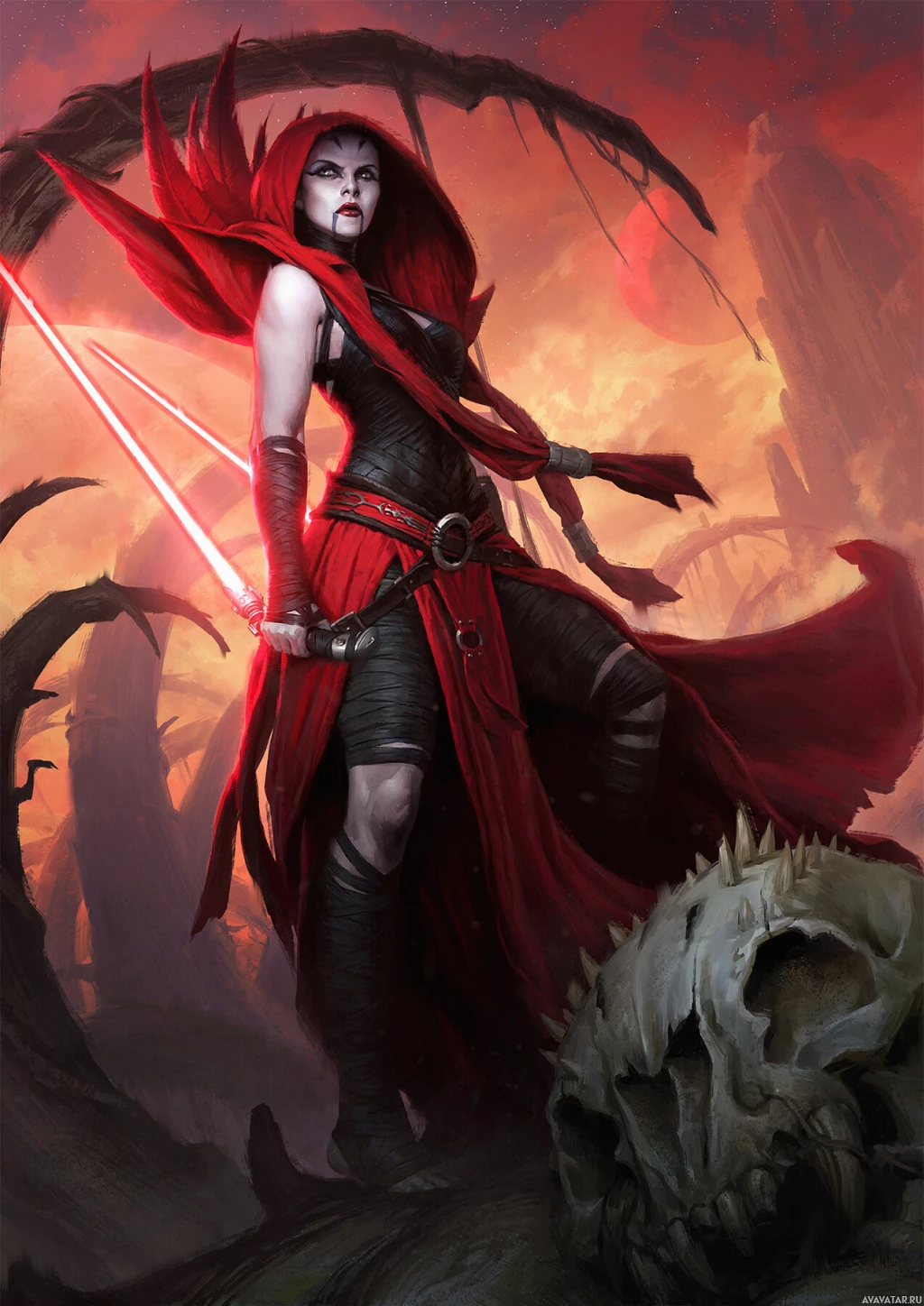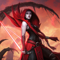 red lightsabers crossed in front of her body, which signifies that she might be a powerful Jedi or Sith character. The background suggests a fantastical or battle setting with fiery elements, possibly indicating