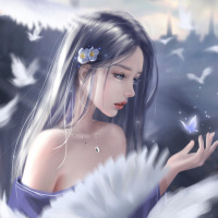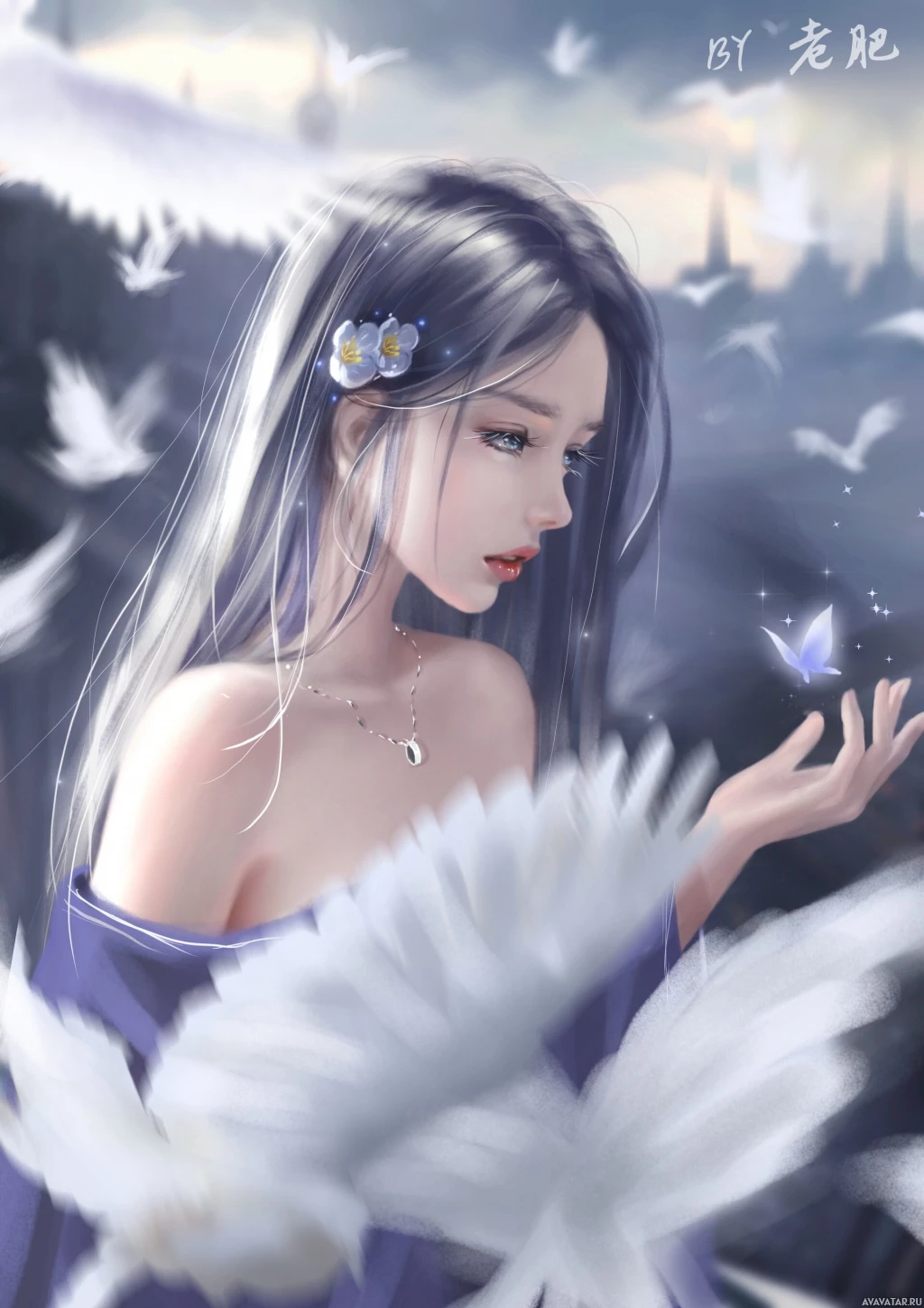 a serene expression on her face and is holding out her hands in front of her, where they are surrounded by birds that are also part of the image's artwork. The sky is visible in the background, suggesting it might be early morning or late evening due to