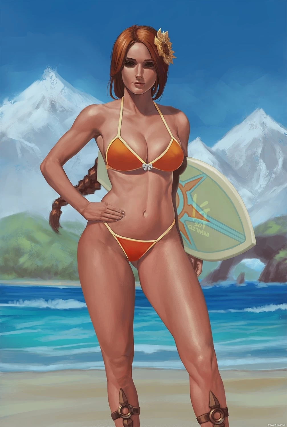 red hair and is wearing a bikini top with orange bottoms, accompanied by a small white flower in her hair. In one hand, she holds a surfboard, suggesting she might be surfing or preparing to do so. The background depicts a beach setting with