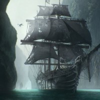 fashioned design, possibly from the age of exploration or pirate vessels. It is moored near