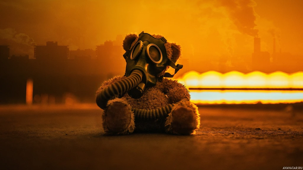a gas mask. The setting appears to be an industrial or post-apocalyptic environment, with a dark and moody atmosphere. There is also some text or symbols visible in the background, which might provide additional context if they were legible.