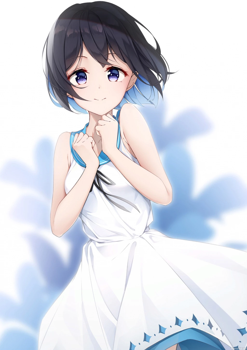 a white outfit with blue trim and a floral pattern. Her expression seems happy or content, as she has