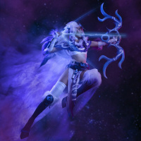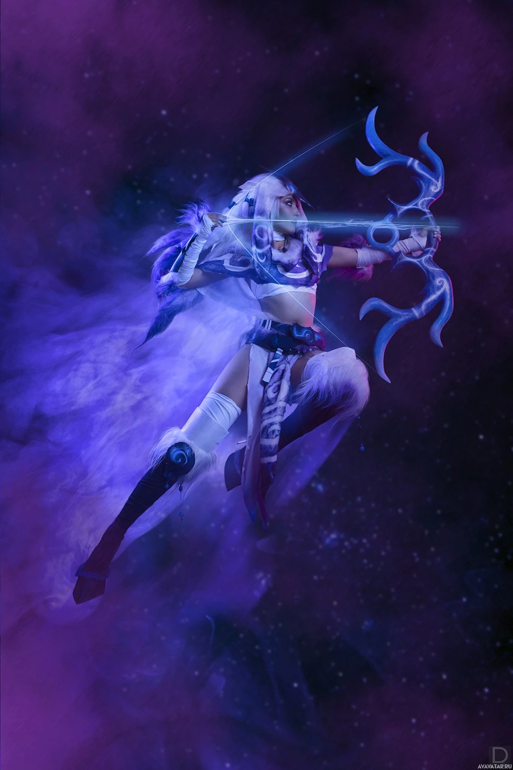 white hair, wielding a bow and arrow in an action pose against a backdrop that appears to be a starry space. She is dressed in what looks like armor or