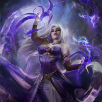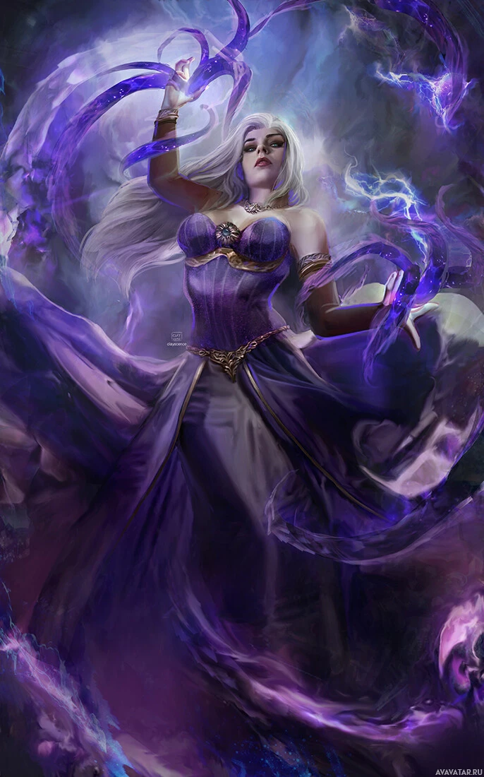 a female figure in a dress with flowing robes and an elaborate headdress. She has her arms outstretched and appears to be casting or manipulating
