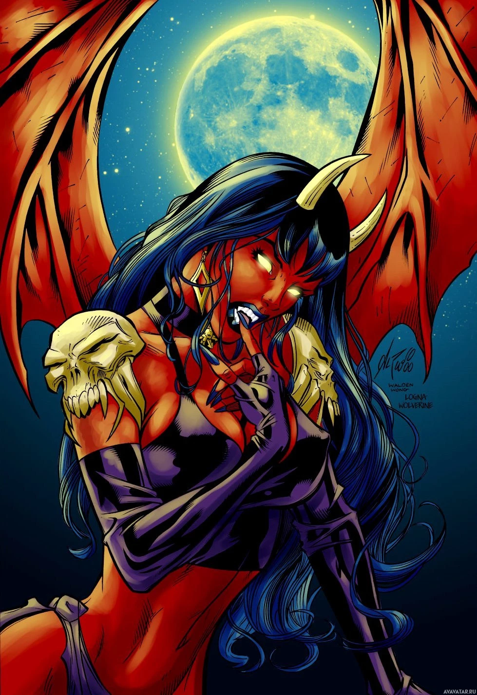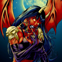 an animated character, a female with demonic features. She has horns, a tail, and her expression suggests she is in