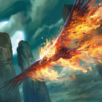 The image depicts a fantasy-themed scene featuring a phoenix in flight. The phoenix is prominently displayed, with its wings spread wide and flames emanating from its body. It's set against a dramatic backdrop of rocky cliffs or ruins under a stormy sky with lightning bolts striking down. The image conveys a sense of fantasy and magic, commonly associated with the mythical creature known as the phoenix.