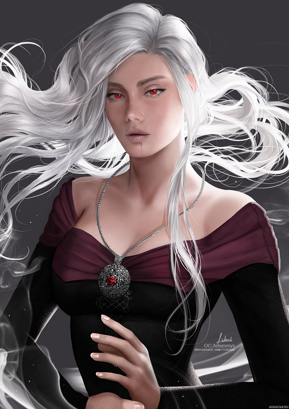 red eyes, which is a notable feature of the artwork. Her attire consists of what appears to be