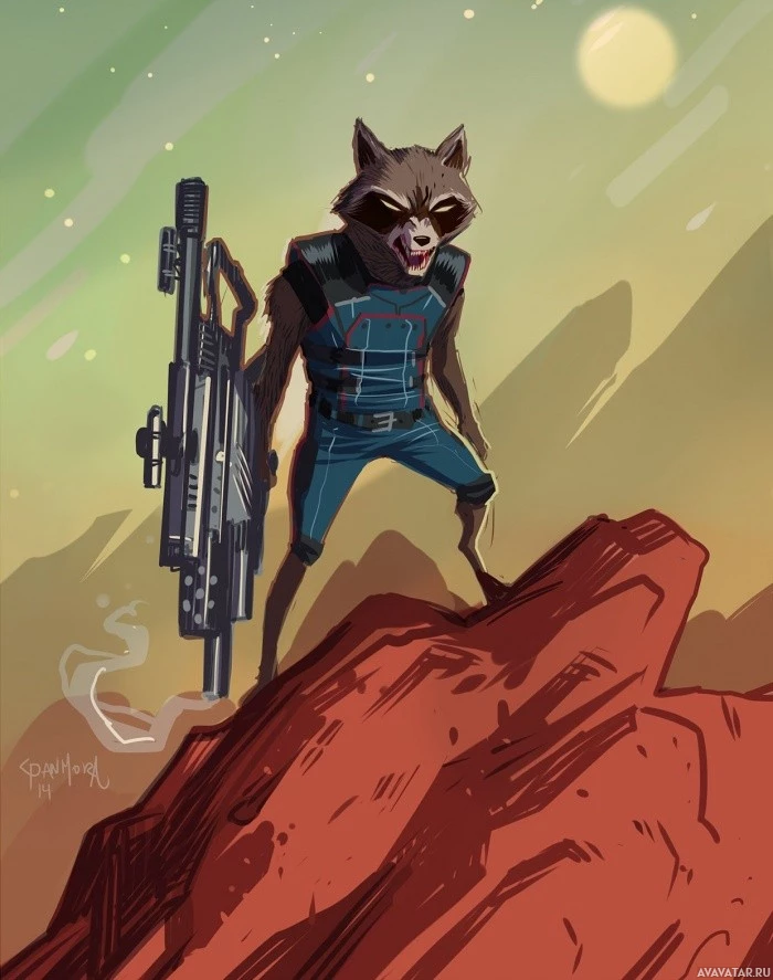 The image features an anthropomorphic raccoon character, which is commonly associated with Rocket Raccoon from