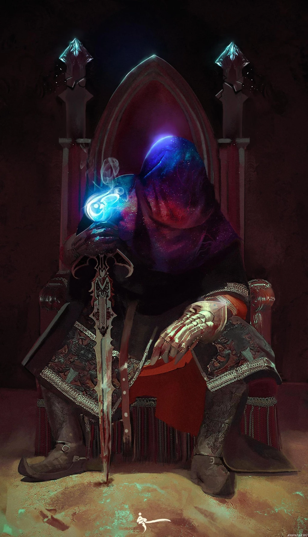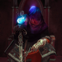 a fantasy scene featuring a character sitting on a throne. This character is holding a sword and appears to be in a regal or powerful position, possibly that of a king or queen. There's also a cloaked figure standing beside the throne, which adds to