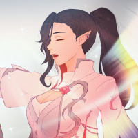 an animated character with closed eyes, giving a sense of calm or contemplation. She is styled as