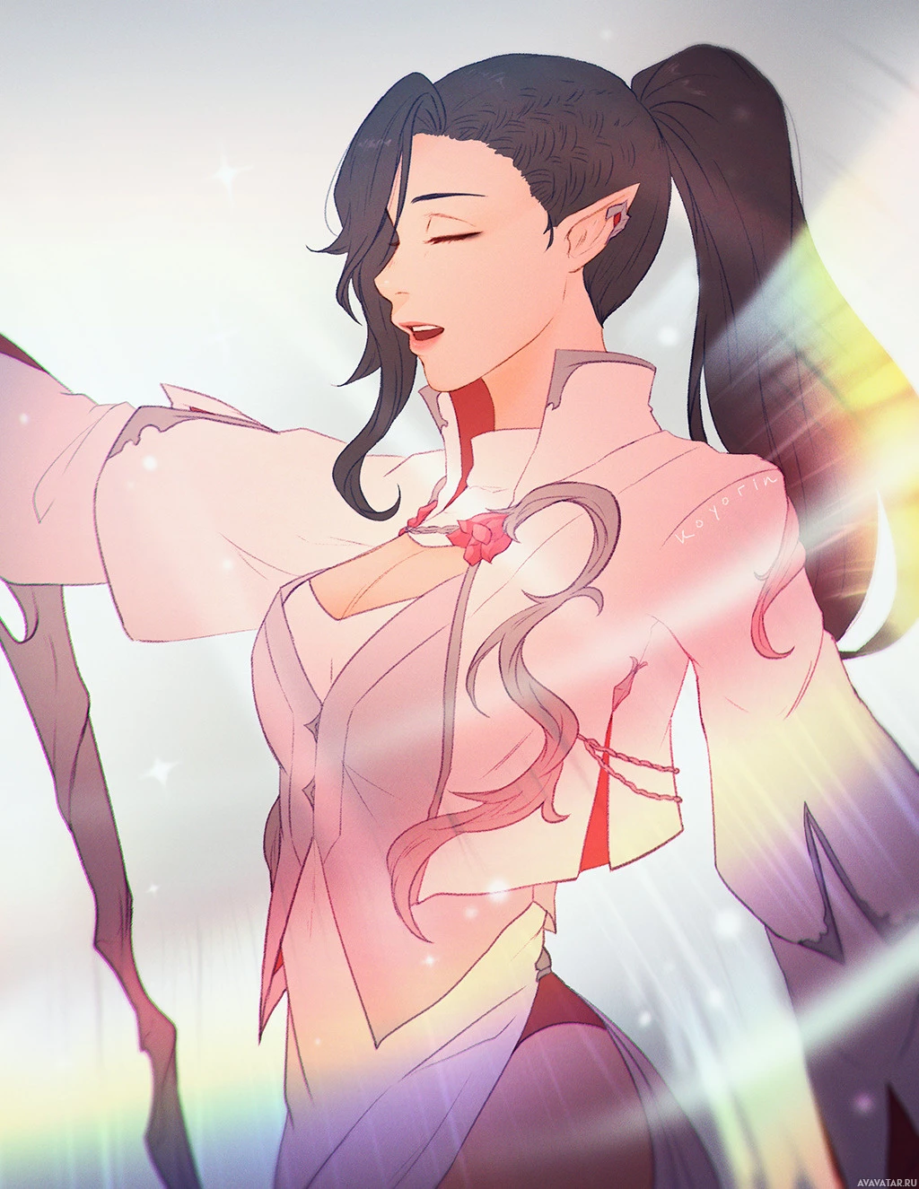 a fantasy elf with long dark hair and what appears to be magical powers, as suggested by the swirling light effects around her hands. Her attire includes