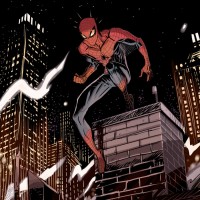 The image shows Spider-Man, a well-known fictional superhero character from comic books published by Marvel Comics. He is depicted in his iconic red and blue suit with web patterns, crouched on a rooftop against the backdrop of an urban skyline at night.