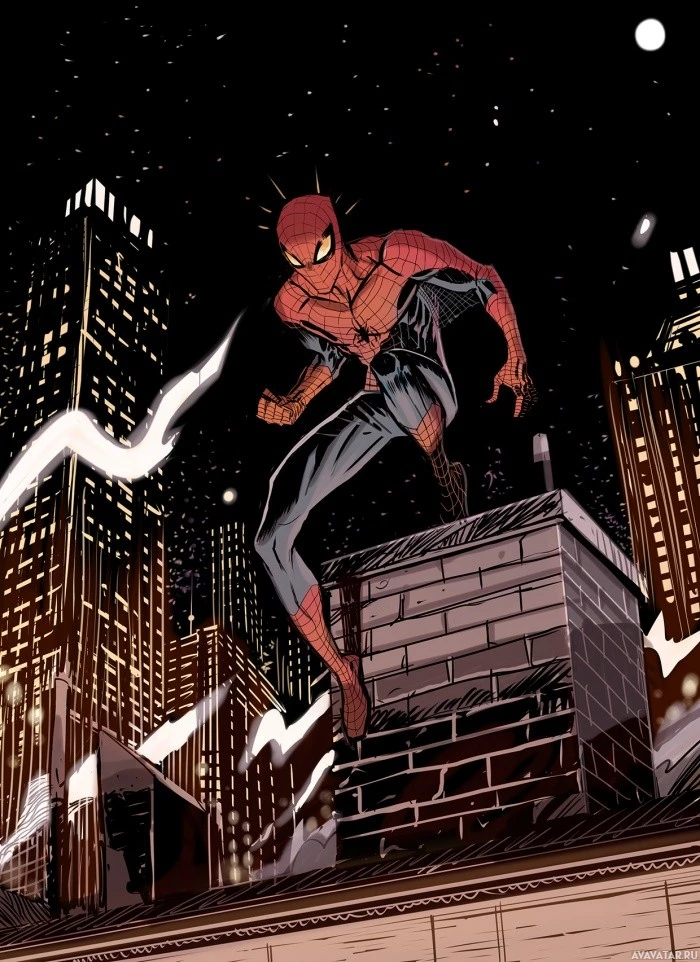 Картинка показывает Человека-паука, известного вымышленного супергероя из комиксов, опубликованных Marvel Comics. Он изображен в своем знаковом красно-синем костюме с веб-узорами, прикованным на крыше на фоне городского горизонта ночью.