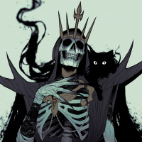 a black cat in the other hand. The artwork has a dark, gothic feel with textured