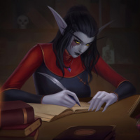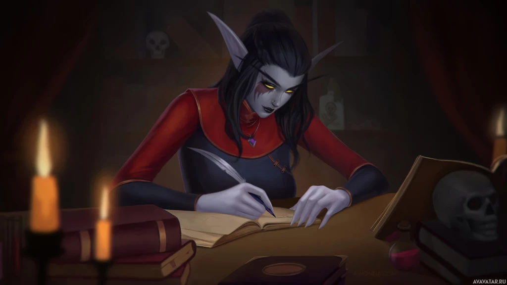 pointed ears and a cloak, suggesting a magical background. She is seated at a desk or table, which has