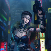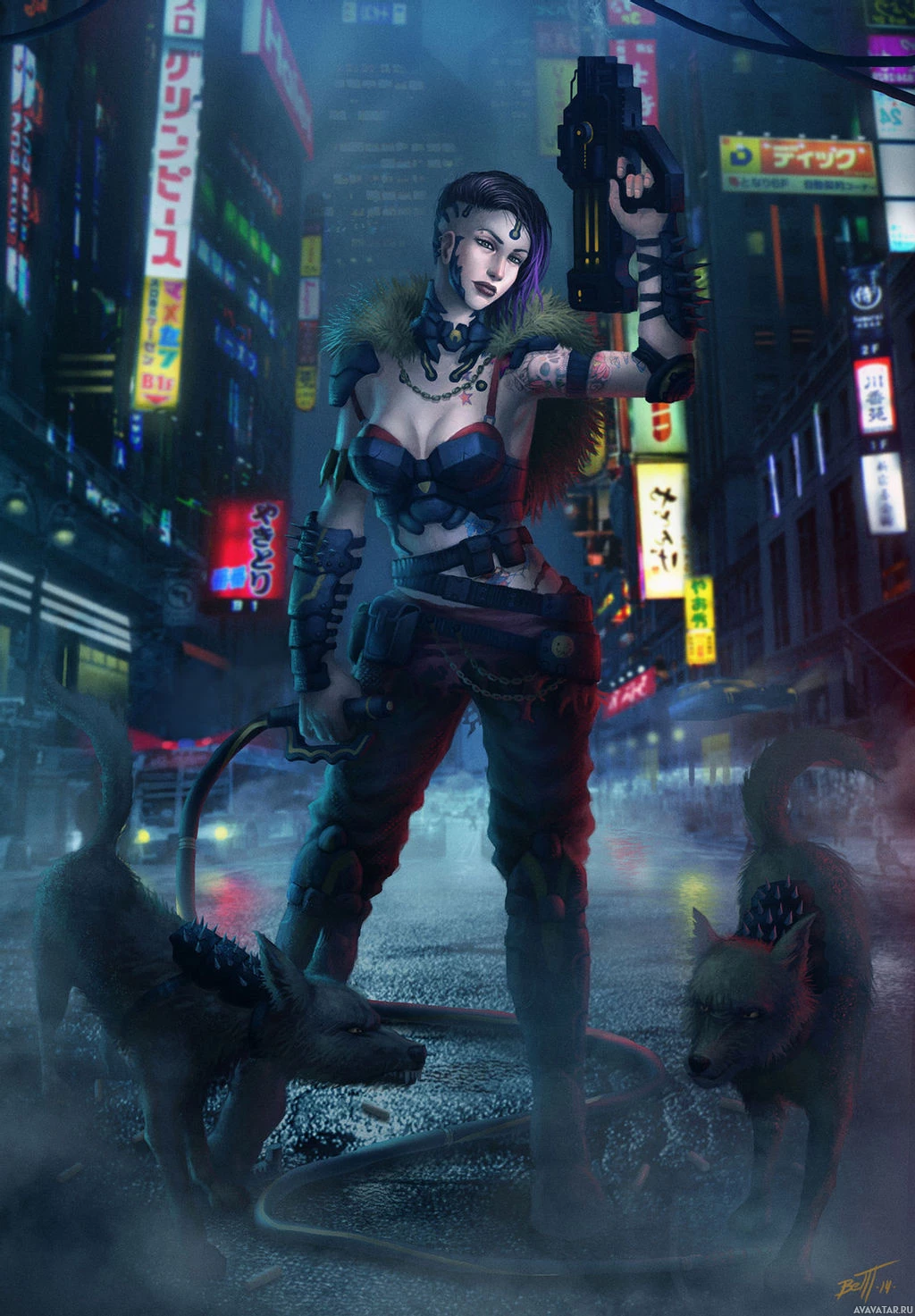 a futuristic cityscape that appears to be inspired by Tokyo's famous neon-lit streets, known as "Pixels." The central figure is a woman with an edgy, punk-like style. She has