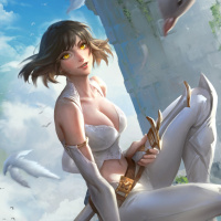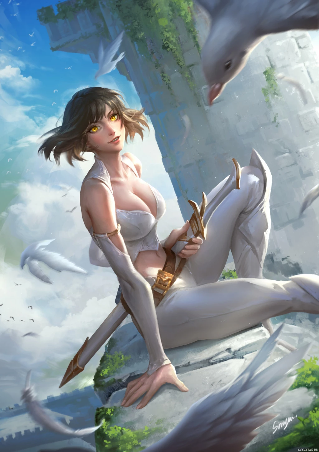 gold accents and a high collar. She is holding a sword in her left hand and there are birds around her. In the background, there's an ancient-looking stone structure with vines growing on it, suggesting a setting of a mythical or