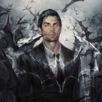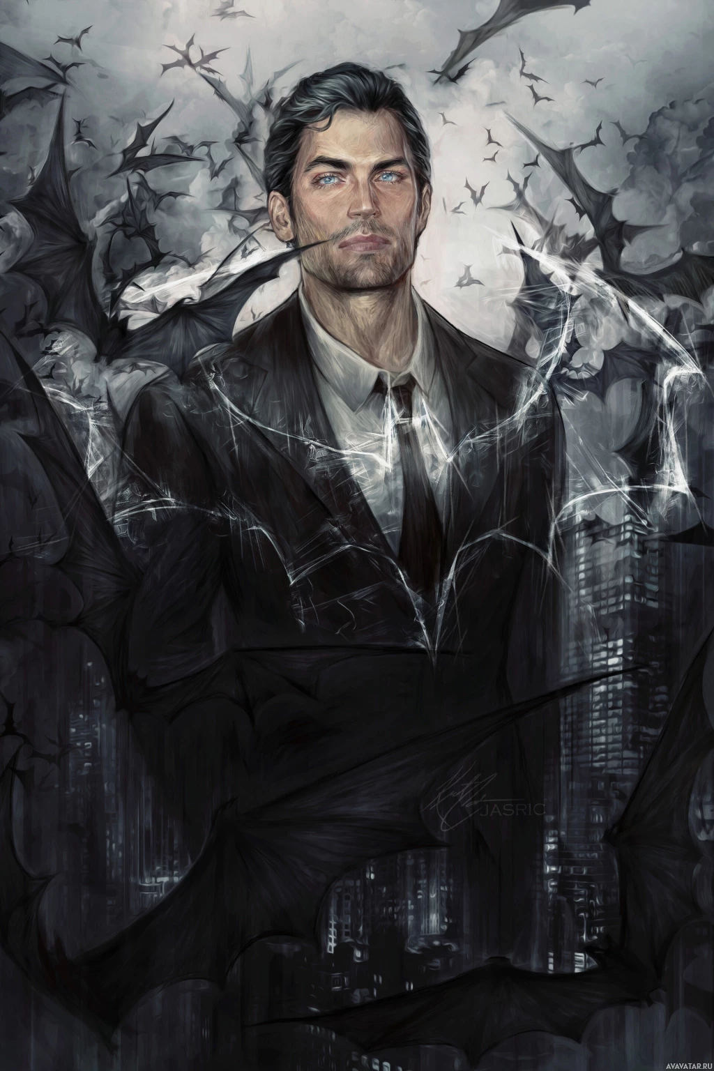 dark hair, wearing a suit and tie. He is set against a backdrop that features what appears to be bat-like silhouettes and