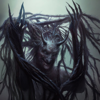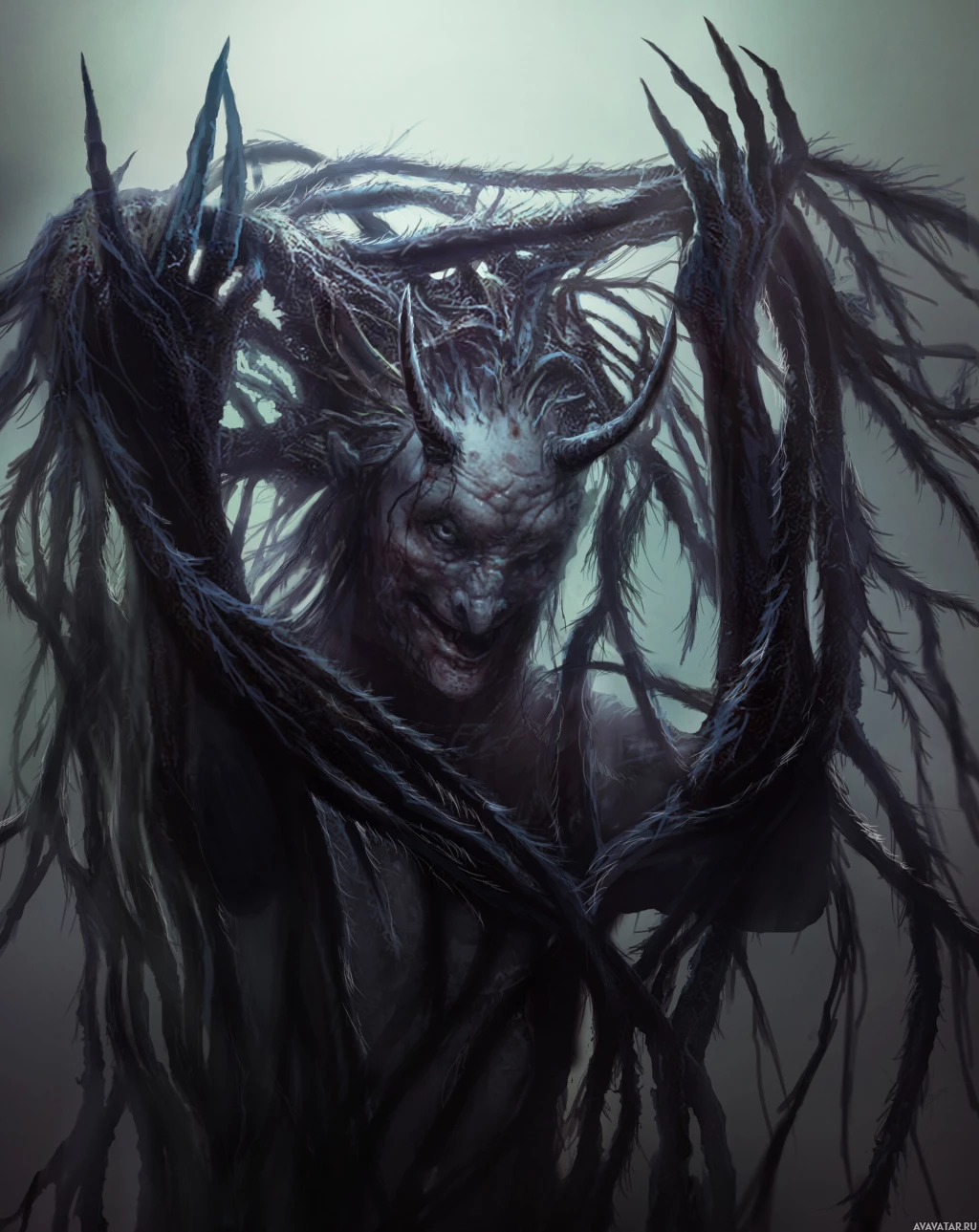 an evil entity. It has dark, gnarled features and appears to have claw-like hands. The figure is set against a somewhat