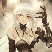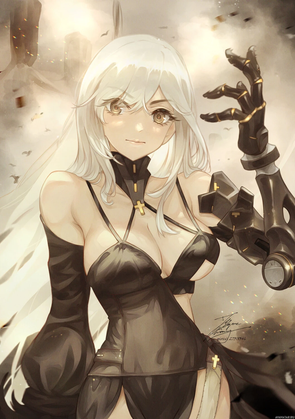 a chaotic scene with clouds, lightning bolts, and falling debris, which suggests she might be in the middle of a battle or powerful spellcasting. The artwork has a high