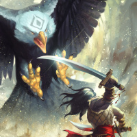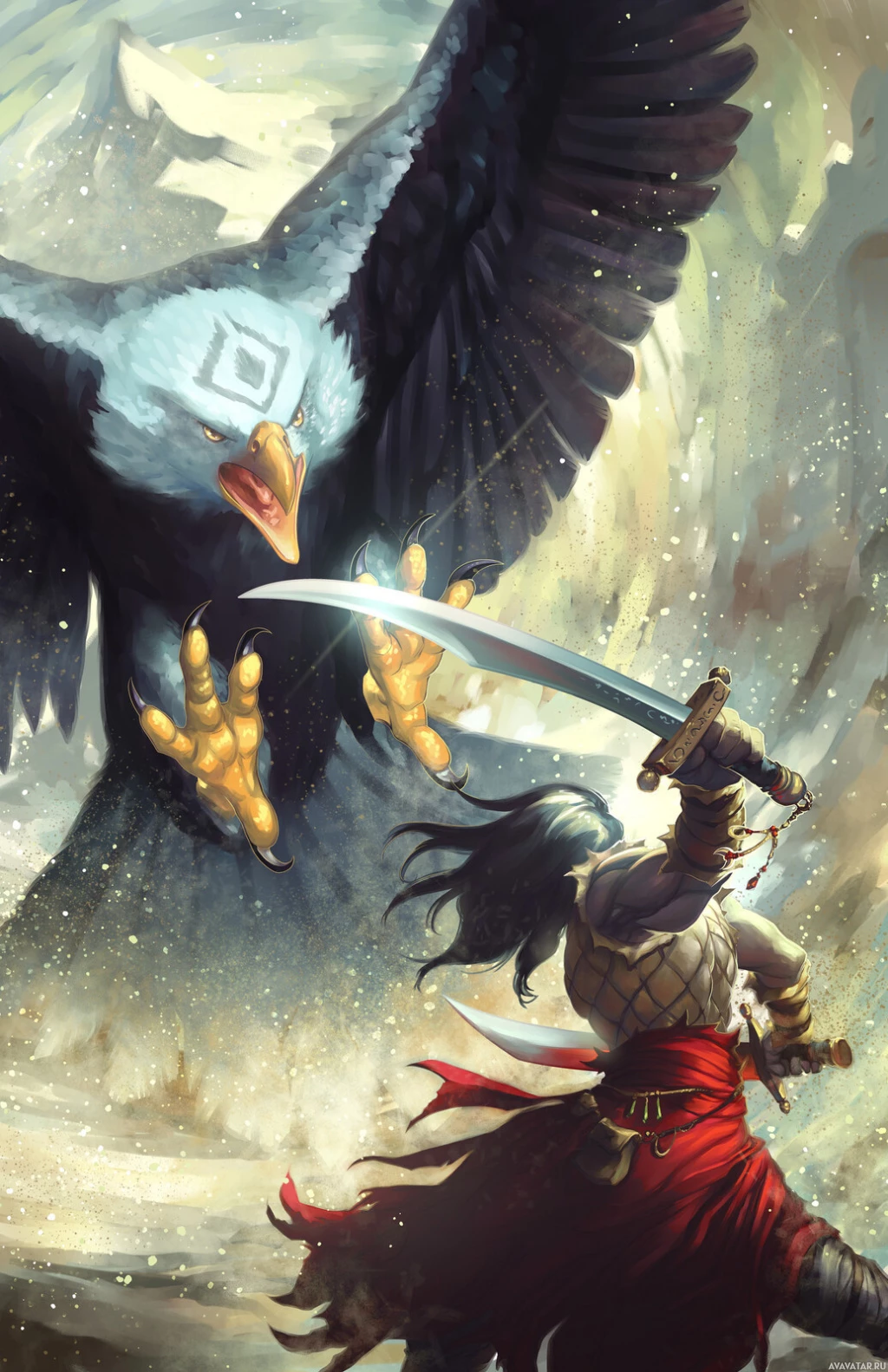 The image depicts a fantasy-themed scene. In the foreground, there's an eagle that appears to be attacking or confronting a warrior. The warrior is holding a sword and seems prepared for combat with the eagle. Both figures are detailed and well-rendered, suggesting they may be characters from