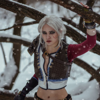 the fantasy atmosphere of the scene. The costume includes intricate details like patterns and textures that are consistent with the design elements associated with Ciri from the game.