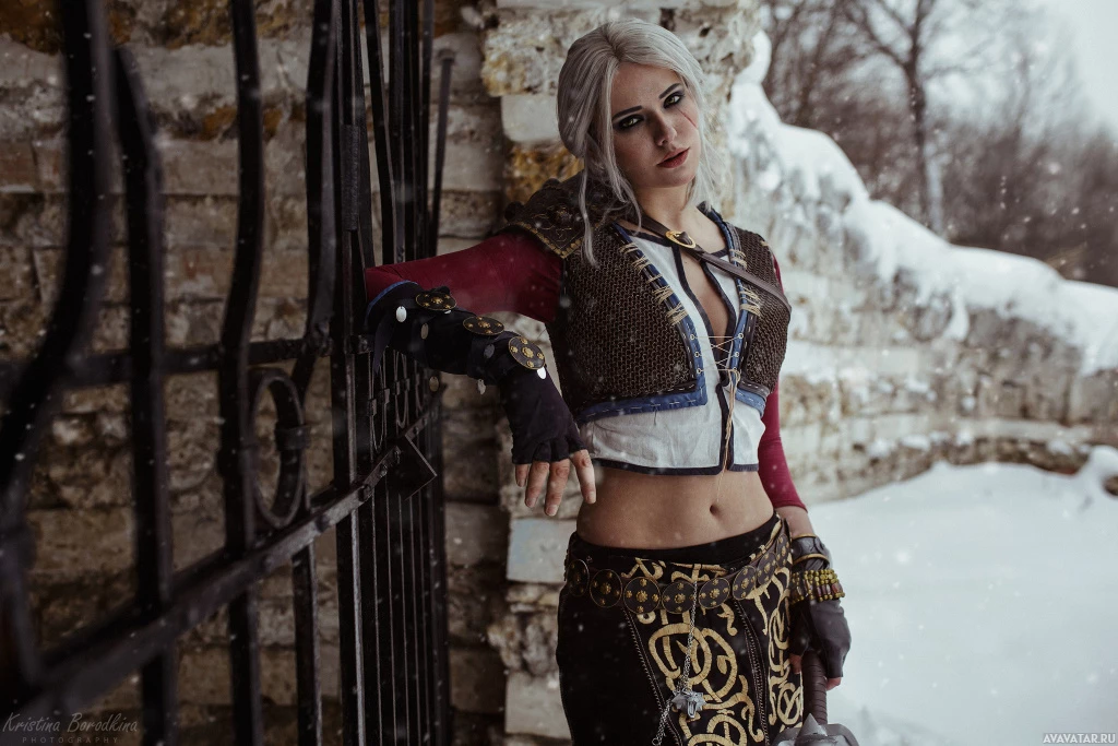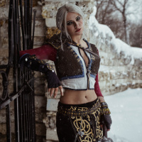 The image shows a person dressed in what appears to be costume attire associated with the character Ciri from "The Witcher 3: Wild Hunt"