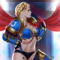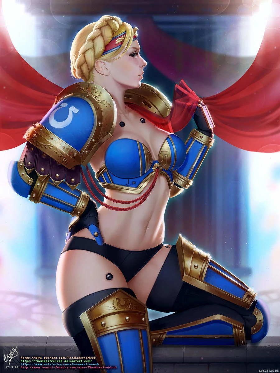 blonde hair, is wearing armor with a blue color scheme, and is holding a sword in her right hand. She's also sitting on a pedestal or platform that looks like it could be part of a historical or architectural setting, possibly representing a throne or