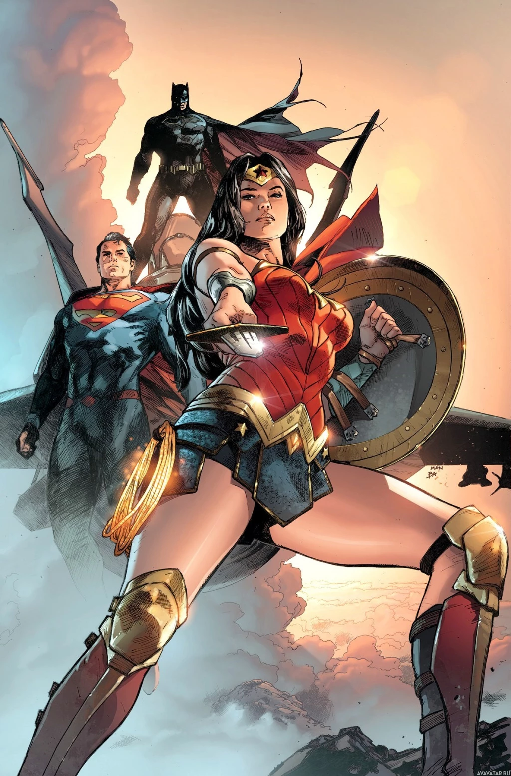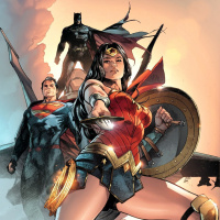 Wonder Woman, Superman, and Batman. They appear to be posing in front of a dramatic