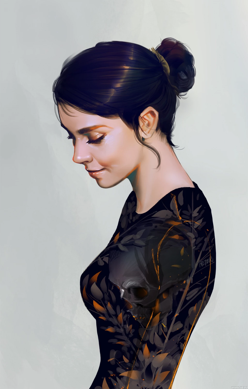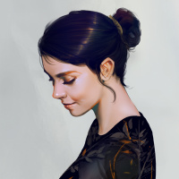 dark hair and appears to be wearing a dress or top with some intricate details, possibly floral or abstract patterns. Her expression is soft and contemplative. The background is subtle and does not distract from the subject.