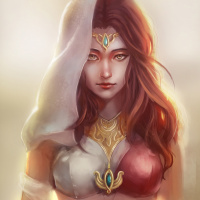 a female character with red hair. She is depicted in an artistic and fantasy-inspired fashion, wearing what appears to be