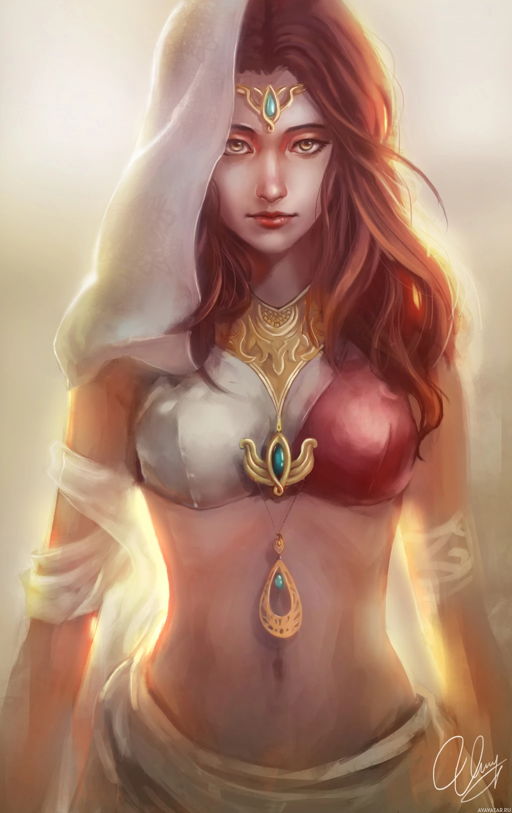 a traditional outfit with elements of Middle Eastern or South Asian design. The character has