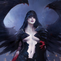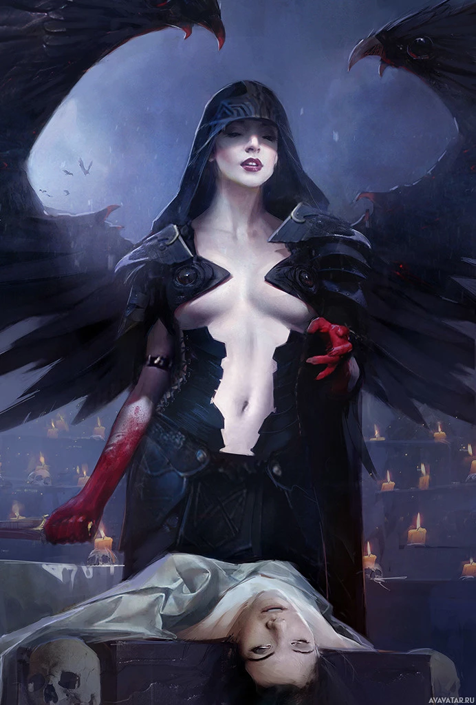 demonic figure with dark attire and feathered wings, symbolizing some kind of supernatural being. In the background, there is another character lying on what looks like a tombstone or memorial, possibly representing death or sacrifice. The overall atmosphere of the image suggests themes of fantasy, mystery, and potentially conflict between light and