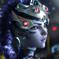 purple hair and a visor with red glowing eyes. She is wearing a futuristic