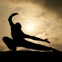 The image shows a silhouette of a person performing a martial arts pose. This could be a kata or a stance from a martial art, such as Taekwondo or Karate. The individual is in a dynamic pose with one arm extended and the other bent at the side, suggesting balance and readiness. The sunset in the background adds an atmospheric effect to the scene.