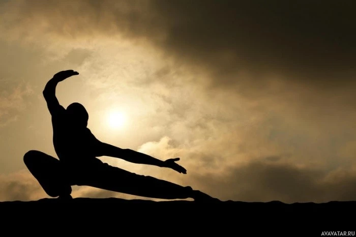 На картинке показан силуэт человека, исполняющего позу боевых искусств. Это может быть ката или позиция из боевого искусства, такого как тхэквондо или каратэ. Человек находится в динамической позе с одной вытянутой рукой, а другая согнута сбоку, что предполагает равновесие и готовность. Закат на заднем плане добавляет атмосферный эффект к сцене.