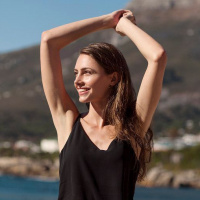black swimsuit, and her arms are raised above her head. She has short hair and appears to be smiling as she enjoys
