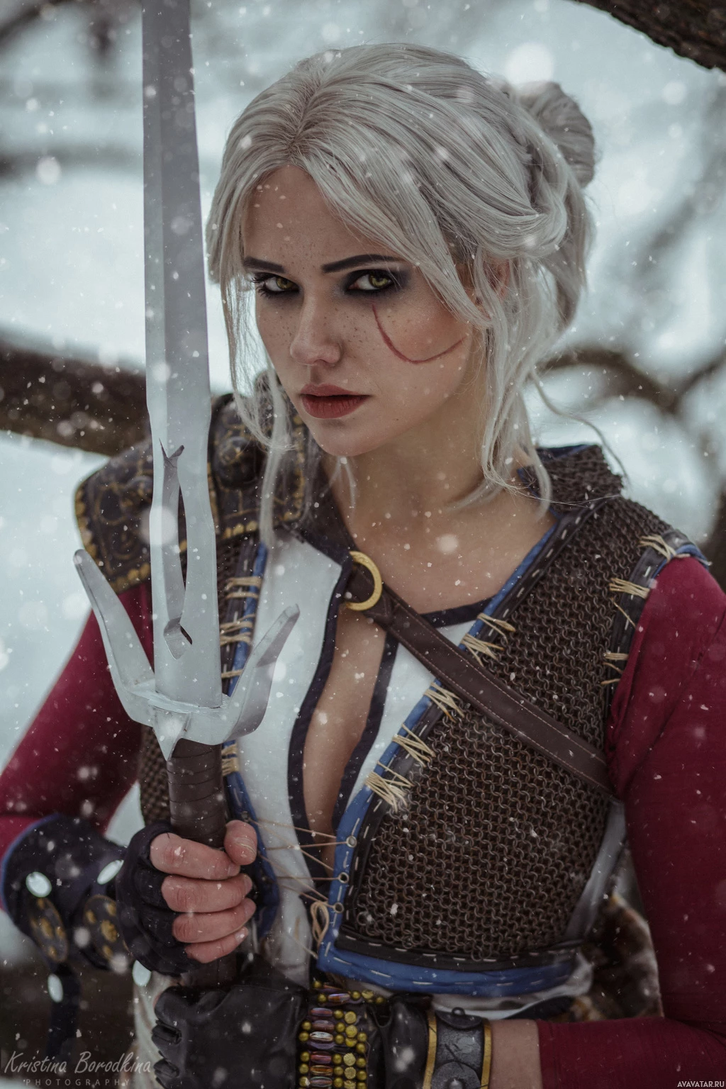 The image features a person dressed as Ciri from "The Witcher 3: Wild Hunt"