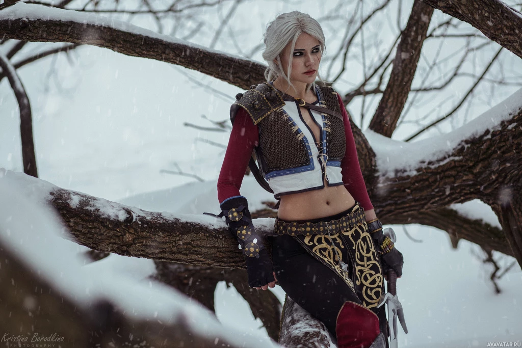 The image features a person dressed as Ciri, the character from "The Witcher" series of