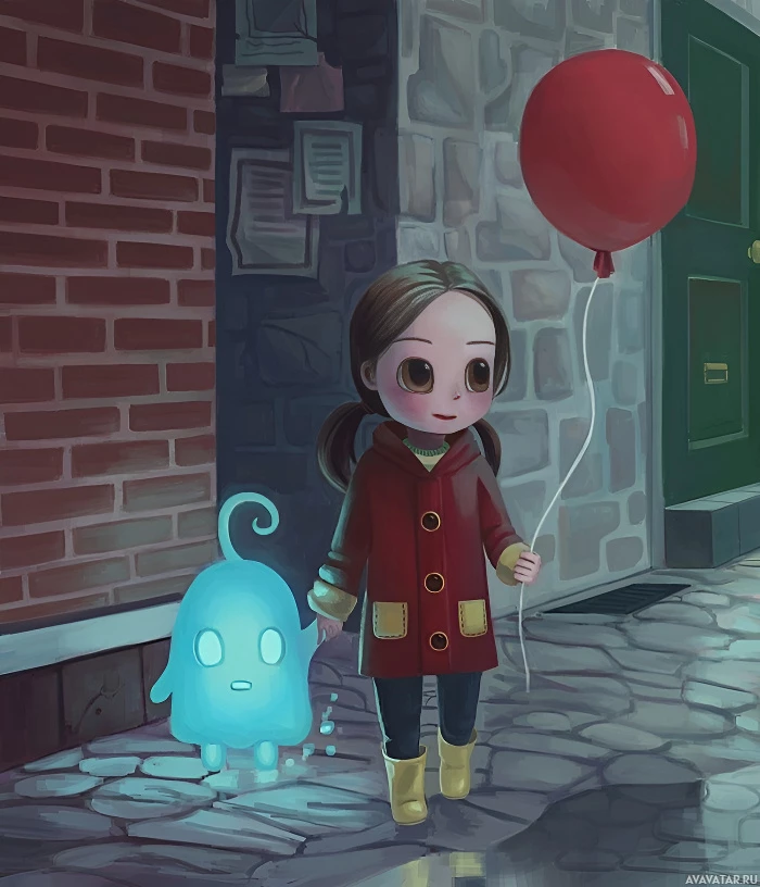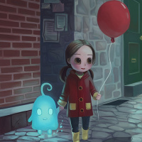 red balloons with strings attached to them. Next to her, there is a small,