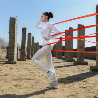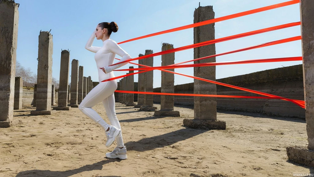 На картинке изображена женщина, одетая в боди или трико и белые туфли. Она бежит мимо чего-то похожего на древние руины или строительную площадку, от ее тела исходят красные лазерные линии, которые отражаются от земли позади нее. Обстановка напоминает городскую среду с чистым небом.