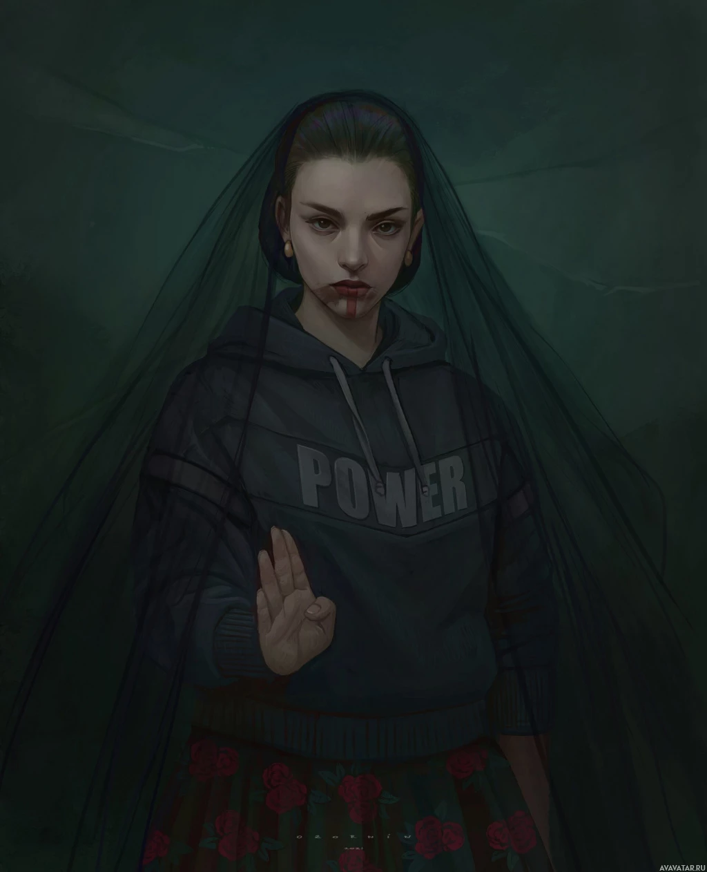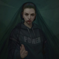 dark hair. She is wearing a hoodie that says "POWER" and has roses on it. There's a visible scratch or wound on her right cheek. Behind her, there appears to be