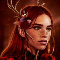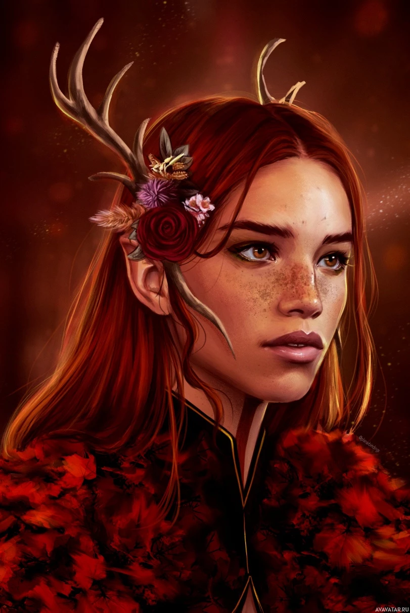 floral accessory is placed near her ear, adding to the fantasy theme of her appearance. The background appears to be a magical or mystical setting with warm,
