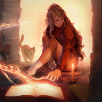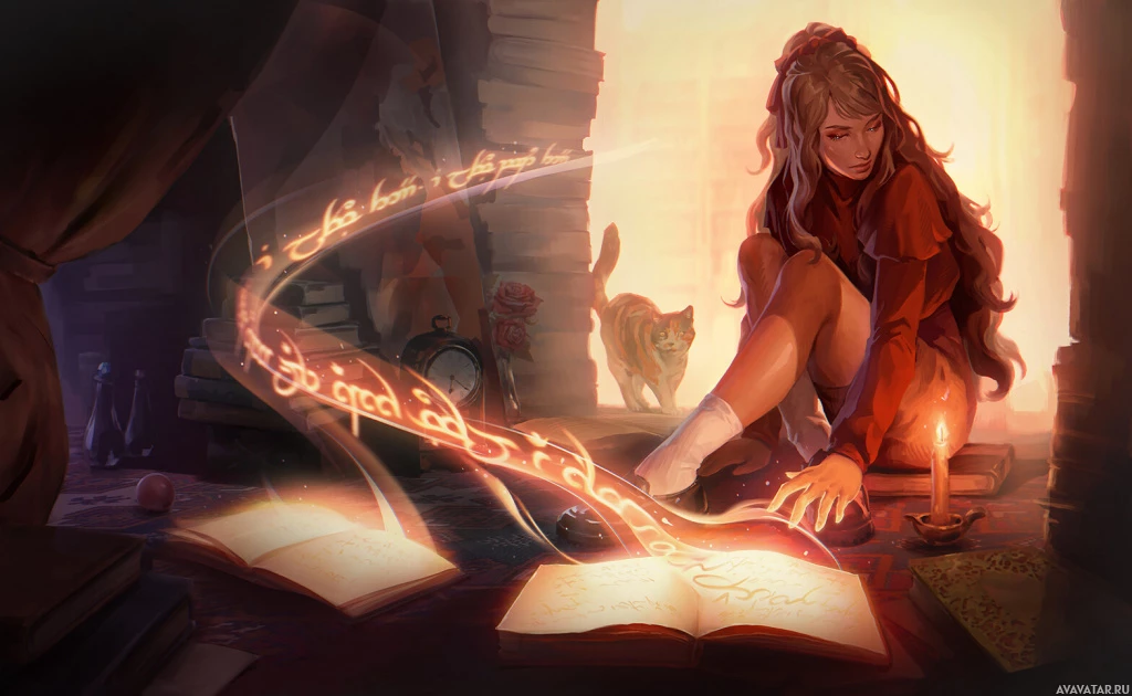 warm room, possibly a study or a sanctuary for studying or practicing magic. There's also a cat nearby, adding to the magical