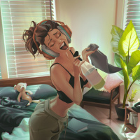 an audio experience. The room seems slightly messy with clothes scattered about, indicating that she might have been in the middle of getting dressed or disarrayed from