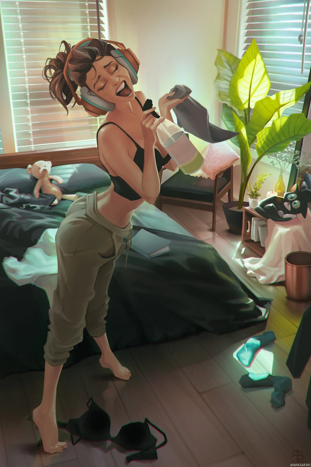 На картинке изображена девушка, которая, судя по всему, находится в своей спальне. На ней надеты наушники, глаза закрыты, возможно, она наслаждается музыкой или прослушиванием аудио. В комнате царит легкий беспорядок из-за разбросанной одежды, что указывает на то, что она, возможно, была в процессе одевания или в беспорядке после недавних занятий.